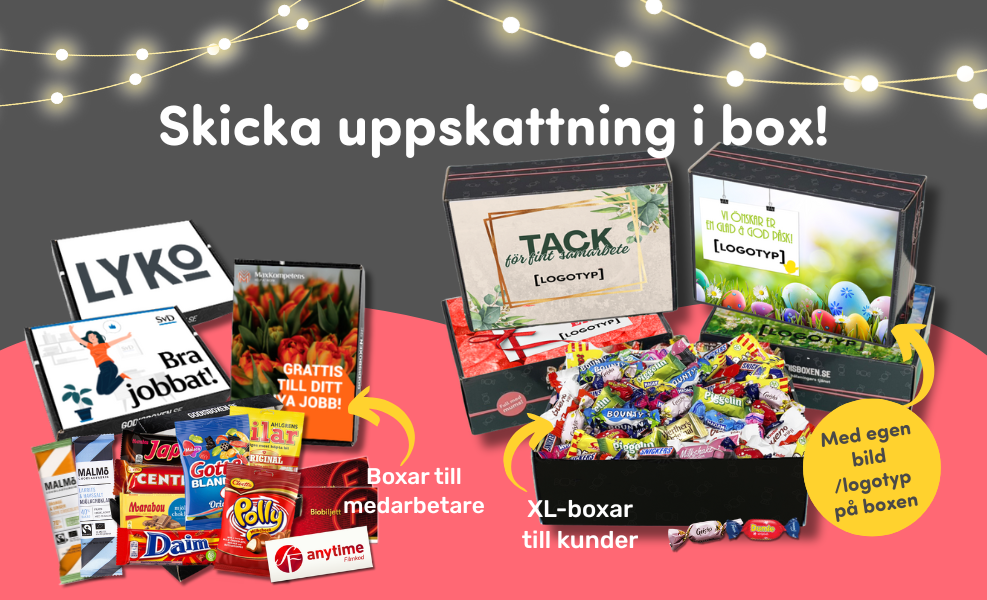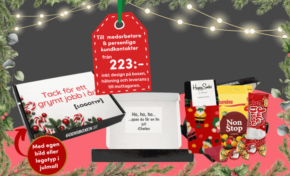 Om ni inte har en egen bild, så kan ni använda någon av dessa mallar. Här hjälper vi er (kostnadsfritt) att lägga in passande text (texten i mallarna går att ändra) och er logga. Designen på boxens lock gör boxen varumärkesbyggande och att ni sticker ut som avsändare av goda gåvor! Ni får alltid ett korrektur att godkänna innan ni ev. bestämmer er för oss som leverantör av goda hälsningar 🤩