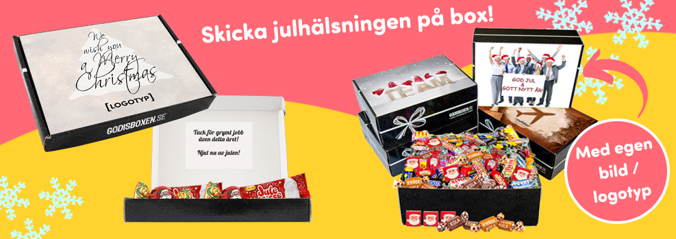 Eller en trevlig sommarpresent till anställda? Vill ni önska medarbetarna Glad påsk? Eller varför inte överraska med en omtänksam present på Alla Hjärtans dag från Ert företag? Ni tar fram (eller tar hjälp av oss) ett trevligt motiv som pryder er gåva och väljer själv vad vi ska fylla godisboxen med. Vi har alltid godis av välkända märken/goda säsongs produkter och ni kan kombinera boxen med biobiljetter, Trisslotter, gåvobevis från Läkarmissionen eller presentkort på tidningsprenumeration.